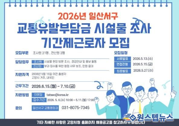 원스텝뉴스 이병희 기자 | 고양특례시 일산서구는 ‘2026년 교통유발부담금 시설물 전수조사’ 실시를 위해 오는 5월 6일부터 보조원 23명을 모집한다.