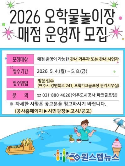 원스텝뉴스 이병희 기자 | 여주도시공사는 2026년 오학물놀이장 운영을 앞두고 이용객 편의 제공을 위한 매점 운영자를 공개 모집한다고 밝혔다.