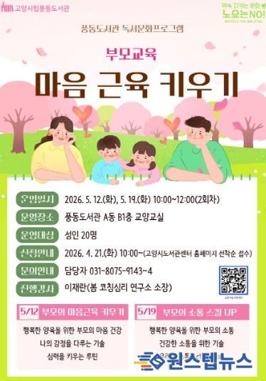 원스텝뉴스 천규영 기자 | 고양특례시 풍동도서관은 오는 5월 독서문화 프로그램 ‘부모교육, 마음 근육 키우기’를 진행한다고 22일 밝혔다.