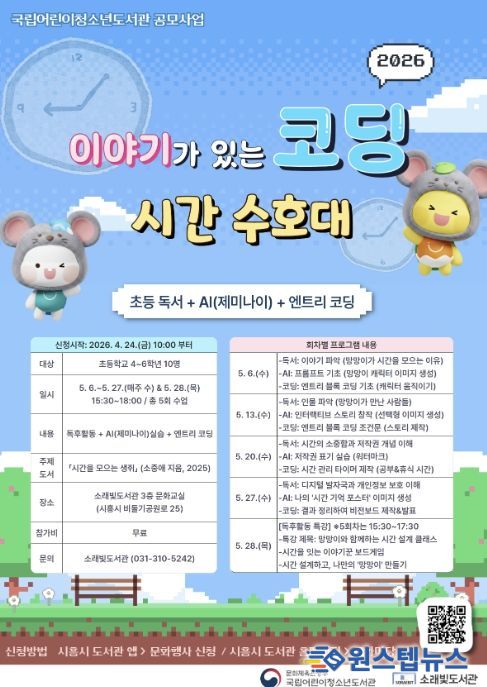 원스텝뉴스 이병희 기자 | 시흥시 소래빛도서관은 국립어린이청소년도서관이 주최하는 ‘2026년 이야기가 있는 코딩’ 공모사업 운영기관으로 선정돼 오는 5월 6일부터 어린이 대상 독서·디지털 융합 프로그램을 운영한다.