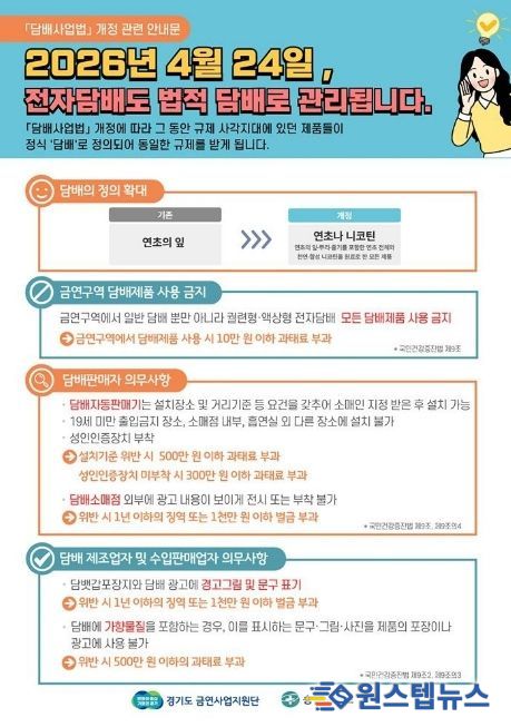 원스텝뉴스 이병희 기자 | 평택시는 2026년 4월 24일부터 시행되는 개정 '담배사업법'에 따라 전자담배를 포함한 모든 니코틴 제품이 ‘담배’로 규정되며, 금연구역 내 전자담배 흡연 시 과태료 10만 원이 부과된다고 밝혔다.