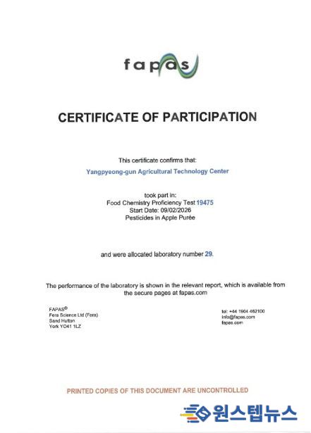 원스텝뉴스 이병희 기자 | 양평군은 영국 식품환경연구청(FERA)이 주관한 ‘2026년 잔류농약 국제비교숙련도 평가’에서 최고 수준의 분석능력을 인정받아 3년 연속 우수성을 입증했다고 21일 밝혔다.