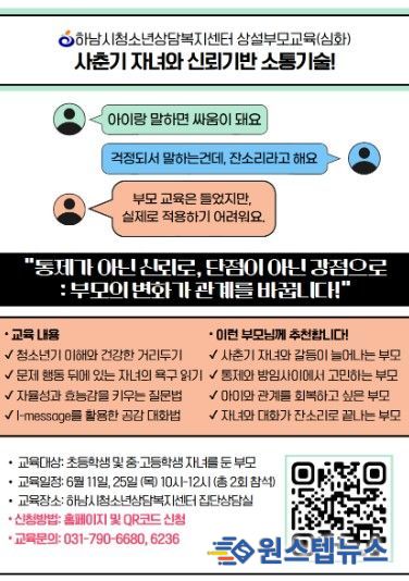 원스텝뉴스 이병희 기자 | 하남시 청소년상담 복지센터가 부모와 자녀 간 소통을 돕기 위한 부모교육 프로그램을 한층 강화한다. 특히 청소년기 자녀와의 대화에 어려움을 느끼는 부모들이 실제로 체감할 수 있는 교육으로 개편한 것이 특징이다.