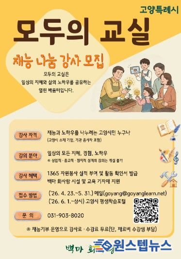 고양시 관계자는 “백마 화사랑 모두의 교실은 시민 한 사람 한 사람의 재능이 소중한 배움으로 연결되는 사업”이라며 “많은 시민들이 강사로 참여해 배움과 나눔이 살아 있는 평생학습도시 고양을 함께 만들어가길 바란다”고 말했다.