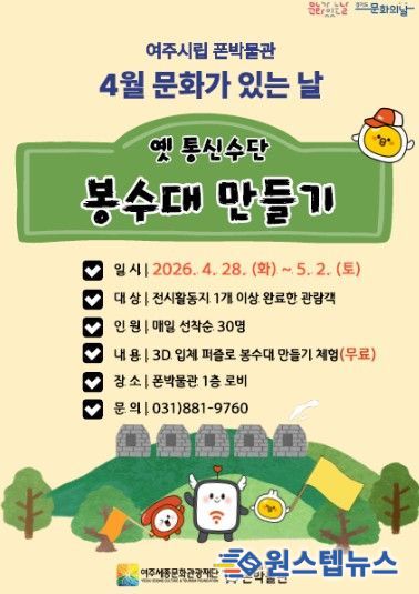 원스텝뉴스 천규영 기자 | 여주세종문화관광재단이 운영하는 여주시립 폰박물관은 4월 '문화가 있는 날'을 맞아 오는 4월 28일부터 5월 2일까지 시민 참여형 체험 행사 '소식을 전하던 봉수대 만들기'를 운영한다.