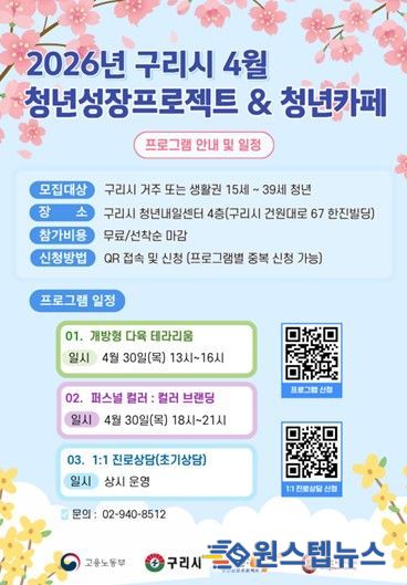 이번 4월 프로그램은 구리시에 거주하거나 생활권을 둔 15세부터 39세까지의 청년을 대상으로 하며, 구리시 청년내일센터 4층에서 진행된다. 참가비는 무료이며 프로그램별 중복 신청이 가능하다. 다만 모집은 선착순으로 마감된다.
