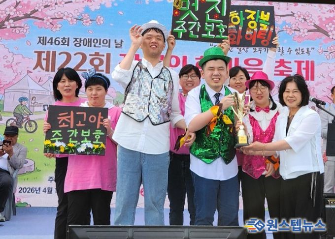 원스텝뉴스 이병희 기자 | 하남시장애인연합회가 주최한 제46회 장애인의 날 기념식 및 제22회 한마음 축제가 하남시장애인복지관에서 성황리에 열렸다. 이날 행사에서는 하남시장애인복지관 주간이용센터 발달장애인 이용인들로 구성된 ‘거북이와 토끼들’ 팀이 노래자랑에 참가해 총 11개 팀과 경연을 펼친 끝에 대상을 수상했다.