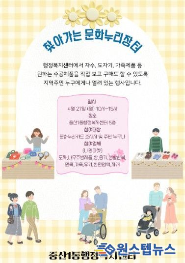 원스텝뉴스 이병희 기자 | 고양특례시 일산동구 중산1동은 오는 4월 27일 오전 10시부터 오후 3시까지 센터 5층 다목적실에서 ‘찾아가는 문화누리장터’를 개최한다.