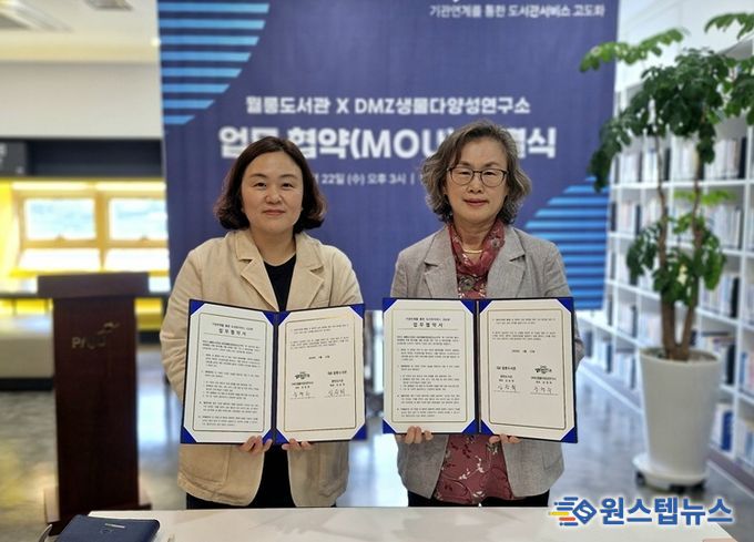 원스텝뉴스 이병희 기자 | 파주시 월롱도서관은 지난 22일 디엠지(DMZ)생물다양성연구소와 지역사회 독서진흥 및 생태환경 분야 협력을 위한 업무협약을 체결했다.
