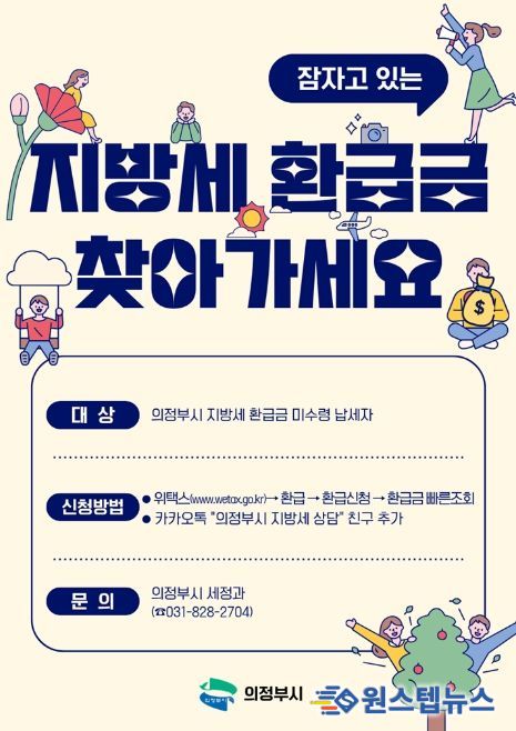 원스텝뉴스 이병희 기자 | 의정부시는 납세자가 아직 찾아가지 않은 지방세 환급금을 돌려주기 위해 5월 말까지 ‘지방세 환급금 일제정리 기간’을 운영한다.