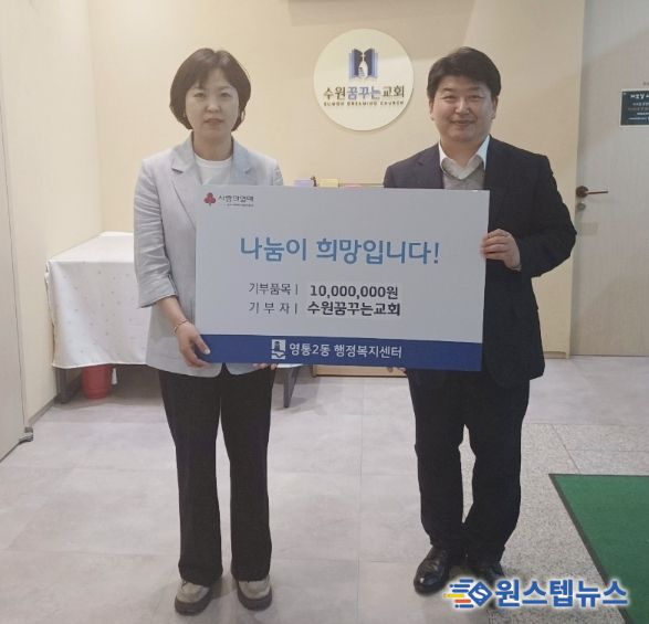 원스텝뉴스 이병희 기자 | 수원시 영통구 영통2동은 지난 23일 수원꿈꾸는교회가 지역사회 내 취약계층 지원을 위해 교인들과 함께 모금한 사랑의 성금 1천만원을 영통2동 행정복지센터에 기부했다고 밝혔다.