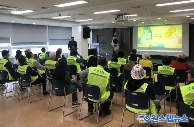 원스텝뉴스 이병희 기자 | 수원시 장안구는 지난 4월 23일, 장안구청 대회의실에서 자원관리사들을 대상으로 안전 및 직무 교육을 실시했다.