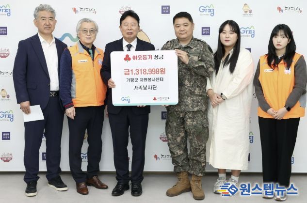 원스텝뉴스 이병희 기자 | 가평군 자원봉사센터 가족봉사단은 23일 가평군청 군수실에서 이웃돕기 성금 기탁 전달식을 가졌다. 이날 행사에는 서태원 가평군수를 비롯해 연기복 가족봉사단 회장, 이명열 가평군 자원봉사센터장 등이 참석했다.