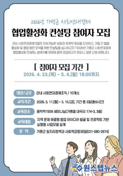 원스텝뉴스 이병희 기자 | 가평군이 사회연대경제 조직 간 협업 활성화를 위해 ‘2026년 사회연대경제 협업활성화 컨설팅’을 추진하고, 참여 조직을 5월 4일까지 모집한다.