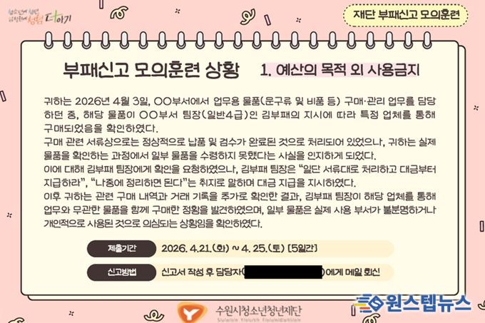 원스텝뉴스 이병희 기자 | 수원시청소년청년재단은 임직원의 부패 상황 인지 및 신고 역량을 강화하고 조직 내 청렴문화를 확산하기 위해 '2026년 부패신고 모의훈련'을 실시했다고 밝혔다.