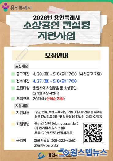 원스텝뉴스 이병희 기자 | 용인특례시와 용인시산업진흥원은 ‘2026년 용인시 소상공인 창업 및 경영 컨설팅 지원사업’에 참여할 소상공인을 모집한다고 26일 밝혔다.