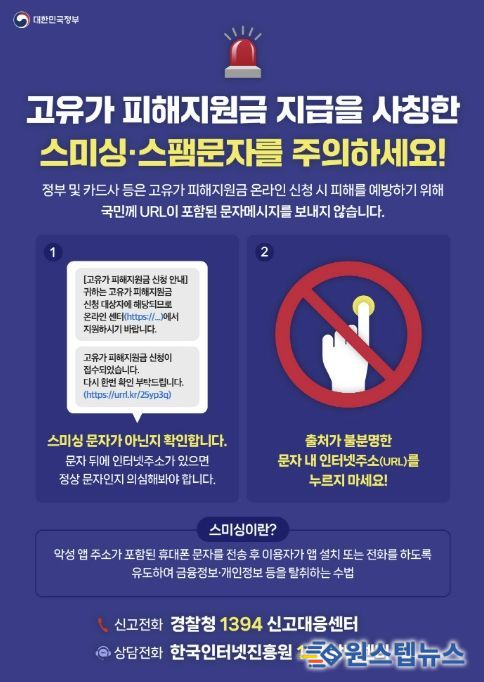 한편, 시는 ‘고유가 피해지원금 지급’을 사칭한 스미싱 문자에 대해 각별한 주의를 당부했다. 고유가 피해지원금은 카드사 또는 지역화폐 공식 앱이나 누리집(홈페이지), 오프라인에서만 신청이 가능하다. 특히 공공기관에서는 고유가 피해지원금과 관련된 인터넷 주소(URL) 링크 연결을 유도하는 문자를 보내거나 전화하지 않는다고 강조했다.