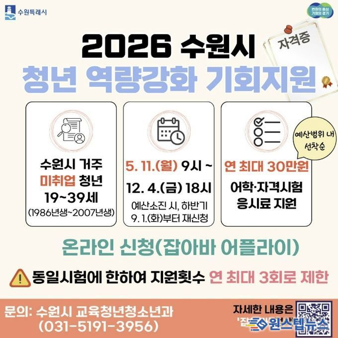 원스텝뉴스 이병희 기자 | 수원특례시는 미취업 청년의 취업 준비 비용 부담을 덜어주는 ‘청년 역량강화 기회 지원 사업’을 12월 4일까지 운영한다. 미취업 청년에게 어학·자격시험 응시료를 1인당 연 최대 30만 원 지원한다.