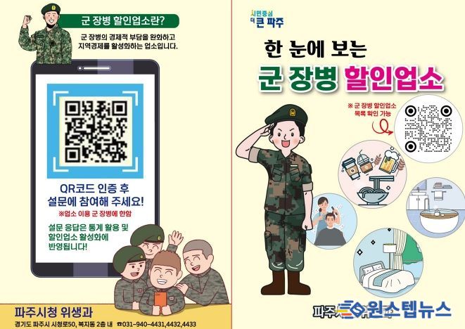 원스텝뉴스 이병희 기자 | 파주시는 군 장병의 경제적 부담 완화와 지역 경제 활성화를 위해 추진 중인 ‘군 장병 할인업소’사업을 더욱 쉽게 알리기 위해 ‘한눈에 보는 군 장병 할인업소’홍보물을 제작해 배부한다.