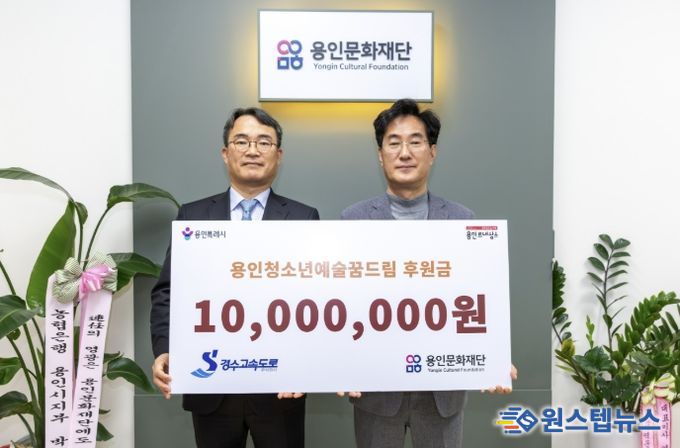 원스텝뉴스 이병희 기자 | 용인문화재단은 지난 23일 경수고속도로(주)로부터 용인시 관내 청소년 예술 장학사업인 ‘용인청소년예술꿈드림’ 지원을 위한 기부금 1,000만 원을 기탁받았다고 밝혔다. 이번 후원은 용인서울고속도로를 이용하는 통행차량 1대당 1원씩 적립하고, 사회공헌예산을 추가로 편성해 지역사회 환원과 기업의 사회적 책임 실천 차원에서 추진됐다.