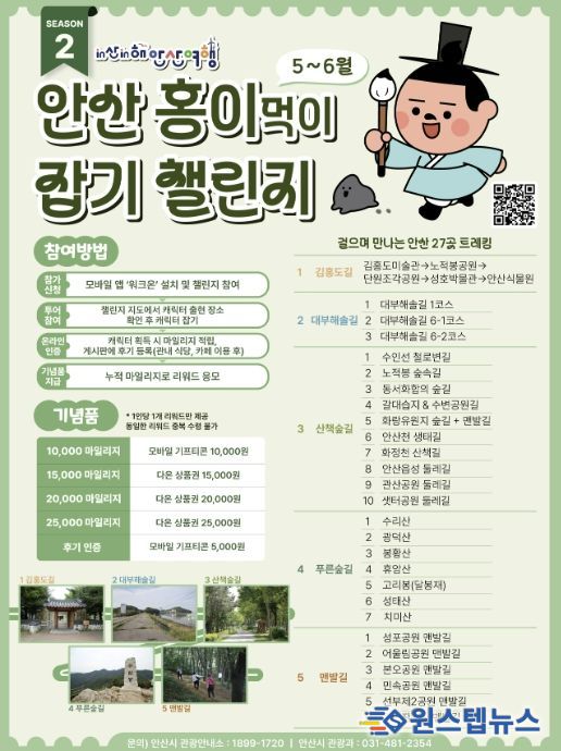 원스텝뉴스 이병희 기자 | 안산시는 5월부터 6월까지 모바일 앱을 활용해 지역의 걷기 코스를 즐길 수 있는 ‘in산in해 안산여행 캐릭터잡기 챌린지’ 2회차를 운영한다고 27일 밝혔다.
