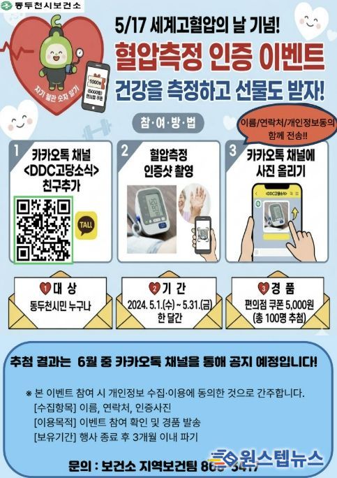 원스텝뉴스 이병희 기자 | 동두천시보건소는 오는 5월 17일 세계고혈압의 날을 기념해 시민들의 심뇌혈관질환 예방과 건강관리 실천을 유도하고자 ‘혈압측정 인증 이벤트’를 운영한다고 밝혔다.