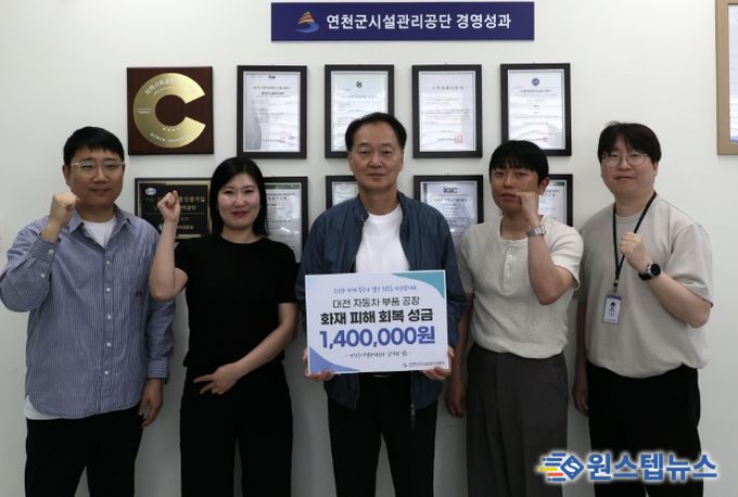 원스텝뉴스 이병희 기자 | 연천군시설관리공단은 지난 23일 대전 자동차 부품 공장 화재로 피해를 입은 근로자 및 이재민 지원을 위한 성금 1,400,000원을 대한적십자사에 전달했다고 밝혔다.