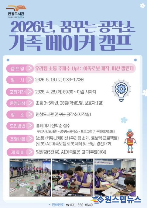 원스텝뉴스 이병희 기자 | 구리시 인창도서관‘꿈꾸는 공작소’는 오는 5월 16일 초등학생 자녀와 보호자가 함께 참여해 가족 간 유대감을 높이고 인공지능을 체험하는 '우리 팀 소통 주파수 Up! : 이족로봇 제작, 미션 챌린지' 가족 메이커 캠프를 운영한다고 밝혔다.