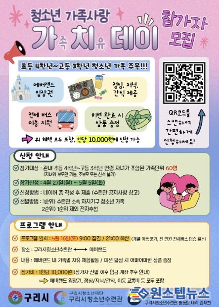 모집 대상은 구리시 관내 초등학교 4학년부터 고등학교 3학년까지의 자녀를 포함한 가족 총 60명이다. 참가자 전원에게는 에버랜드 자유이용권을 비롯해 식사와 간식, 전세버스 이동 지원 등이 제공된다.