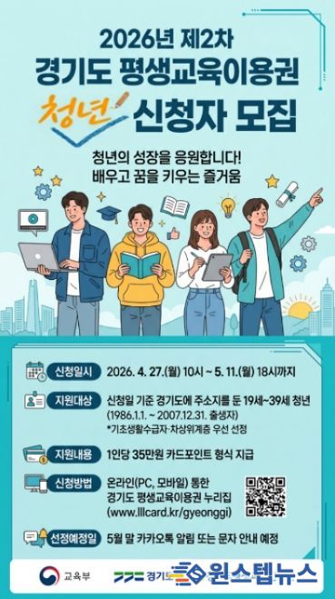 이용권은 전국 평생교육 이용권 등록기관(경기도: 739개소, 평택시: 28개소)에서 사용할 수 있다. 특히 올해부터 국가장학금 수혜자도 중복 지원이 가능해짐에 따라, 저소득층 대학생 등 청년층의 학습 기회가 더욱 확대될 전망이다. 신청은 경기도 평생교육이용권 누리집을 통해 온라인으로 가능하며, 선정자는 본인 명의 카드에 포인트 형태로 지원금을 받는다.