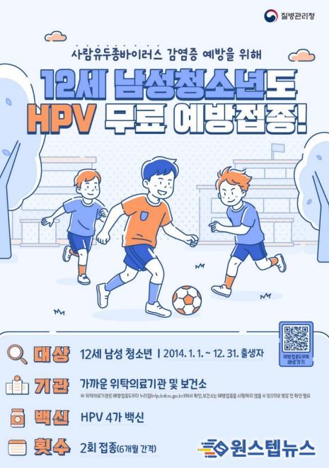 신규 지원 대상은 2014년 1월 1일부터 12월 31일 사이에 출생한 남성 청소년이며, HPV 4가 백신을 6개월 간격으로 총 2회 무료로 접종받을 수 있다.