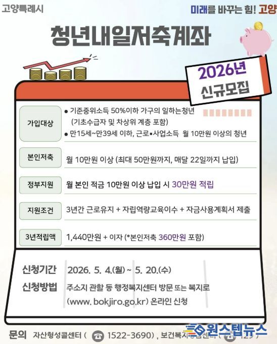 원스텝뉴스 이병희 기자 | 고양특례시는 5월 4일부터 시작하는 청년내일저축계좌 신규 가입자 모집을 앞두고, 가입 독려에 나섰다.