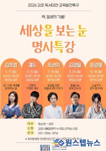 원스텝뉴스 천규영 기자 | 김포시 도서관은 2026 김포 독서대전 교육발전특구 사업으로 '세상을 보는 눈, 명사특강'을 오는 5월 17일부터 10월 18일까지 5회에 걸쳐 관내 도서관 3곳에서 진행한다.