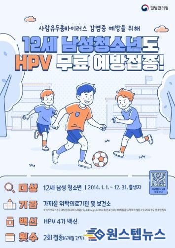 12세 남성청소년은 5월 6일부터 HPV 4가 백신으로 예방접종을 받을 수 있다. 접종은 0개월, 6개월 간격으로 총 2회에 걸쳐 실시되며, 접종 비용은 국가에서 전액 지원한다. 예방접종은 주소지와 관계없이 가까운 보건소 등 위탁의료기관에서 가능하다.