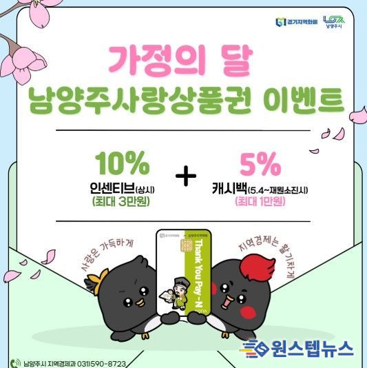 원스텝뉴스 이병희 기자 | 남양주시는 남양주사랑상품권 인센티브 예산을 확대하고 5월 가정의 달을 맞아 특별 혜택을 제공한다고 27일 밝혔다.