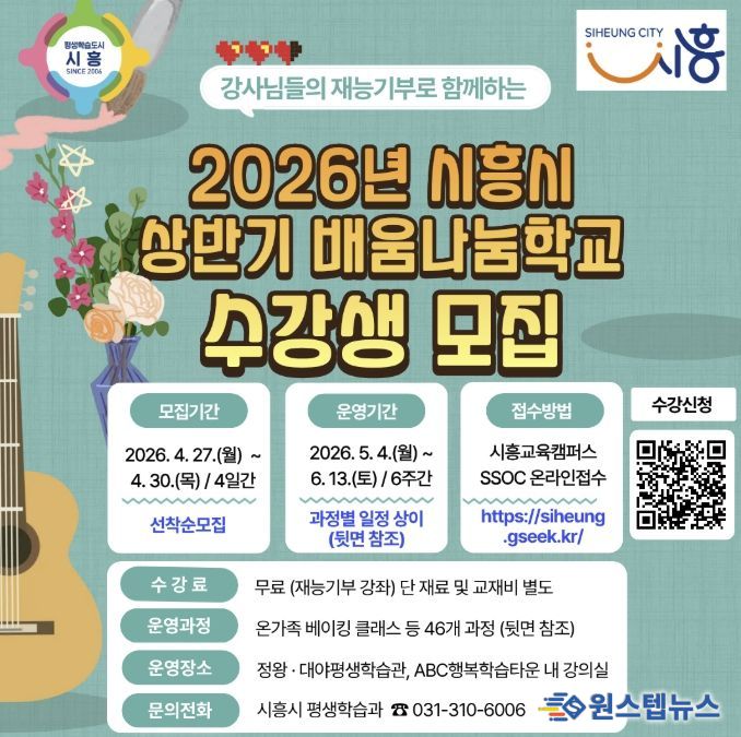 원스텝뉴스 이병희 기자 | 시흥시는 시민이 직접 강사가 되어 재능을 나누는 열린 평생학습 사업 ‘2026년 상반기 시흥시 배움나눔학교’에 참여할 수강생을 모집한다.