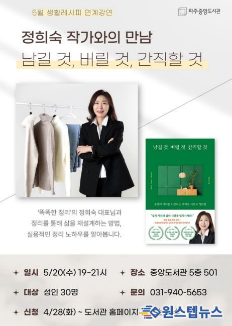 원스텝뉴스 이병희 기자 | 파주시 중앙도서관은 오는 5월 20일 19시, 정리 전문가 정희숙 작가를 초청한 '남길 것, 버릴 것, 간직할 것' 강연을 개최한다.