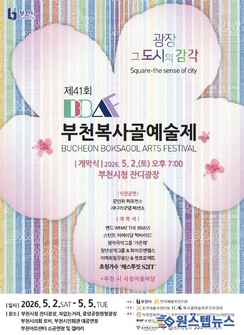 원스텝뉴스 천규영 기자 | 부천시는 ‘제41회 부천복사골예술제’를 5월 2일부터 5일까지 4일간 부천시청 잔디광장과 중앙공원, 부천아트센터 일원에서 연다.