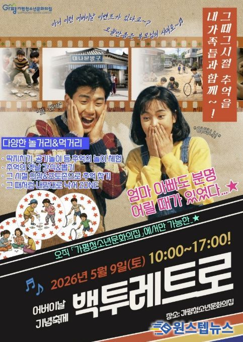 가평 군민을 대상으로 진행하는 이번 행사는 70~90년대 감성을 담은 체험과 놀이를 통해 청소년과 보호자 세대가 추억을 공유하도록 기획됐다.