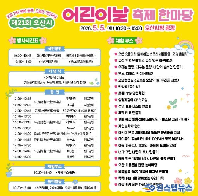원스텝뉴스 천규영 기자 | 오산시는 오는 5월 5일 어린이날을 맞아 오산시청 광장에서 ‘제21회 오산시 어린이날 축제 한마당’을 개최한다고 밝혔다.