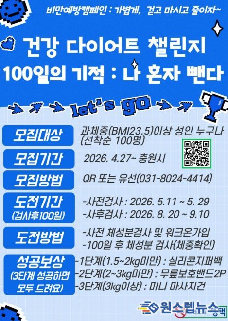 원스텝뉴스 이병희 기자 | 평택시는 시민들이 스스로 비만 관리 능력을 키우고 건강한 생활 습관을 정착시킬 수 있도록 돕는 비만 예방 프로그램 '100일의 기적’참가자를 모집한다고 밝혔다.