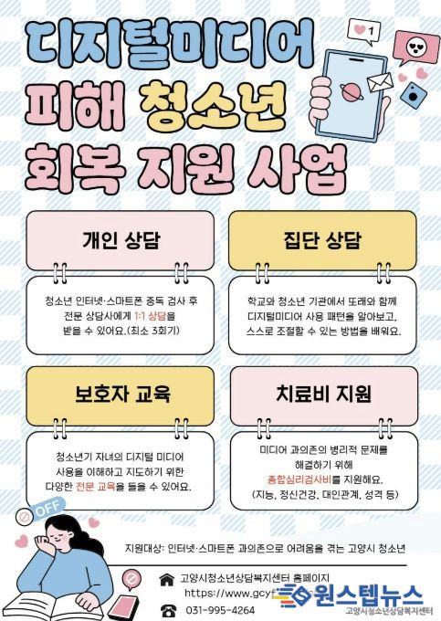 원스텝뉴스 이병희 기자 | 고양시청소년재단 산하 고양시청소년상담복지센터는 디지털 유해환경에 의한 청소년의 디지털 과의존 및 사이버 도박 등의 사회문제를 예방하고 치료하기 위해 오는 5월부터 12월까지 ‘디지털미디어 피해 청소년 회복 지원 사업’을 운영한다고 밝혔다.