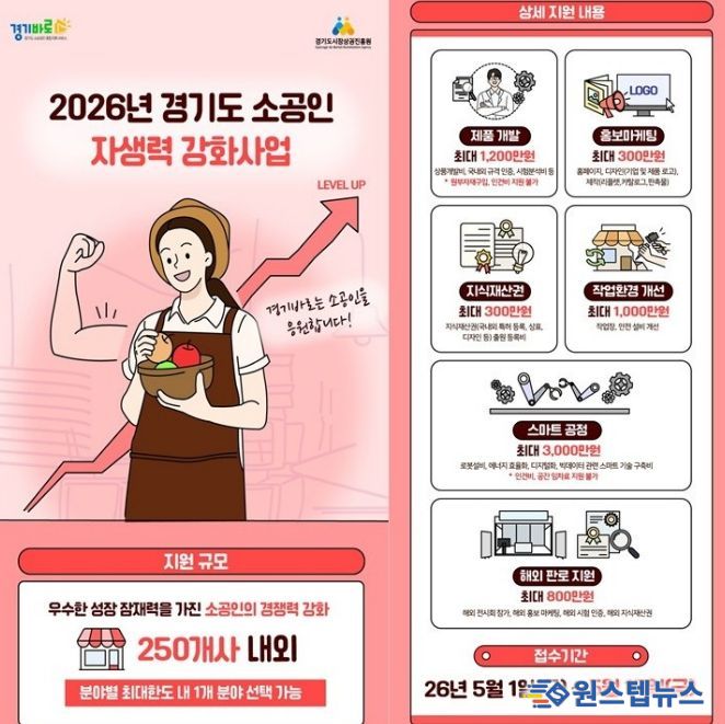 참여를 희망하는 소공인은 오는 5월 1일부터 5월 15일 오후 6시까지 ‘경기바로’누리집을 통해 온라인으로 신청하면 된다. 심사는 정량·정성 평가를 거쳐 60점 이상 고득점순으로 선정될 예정이며, 선정 결과는 6월 중 개별 통보된다.