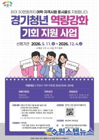 원스텝뉴스 이병희 기자 | 이천시가 오는 5월 11일부터 미취업 청년의 어학·자격시험 응시료를 지원하는 ‘경기청년 역량강화 기회지원 사업’ 대상자 모집에 들어간다.