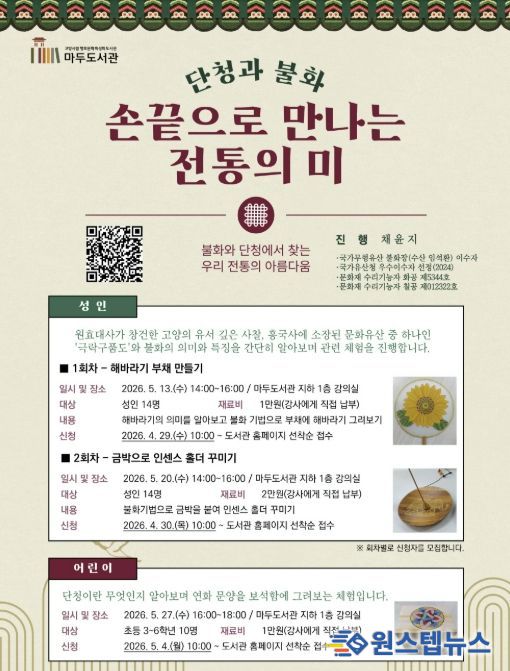 원스텝뉴스 이병희 기자 | 고양특례시 마두도서관은 오는 5월, 단청과 불화를 주제로 우리 전통의 아름다움을 체험할 수 있는 프로그램 ‘손끝으로 만나는 전통의 미’를 운영한다.