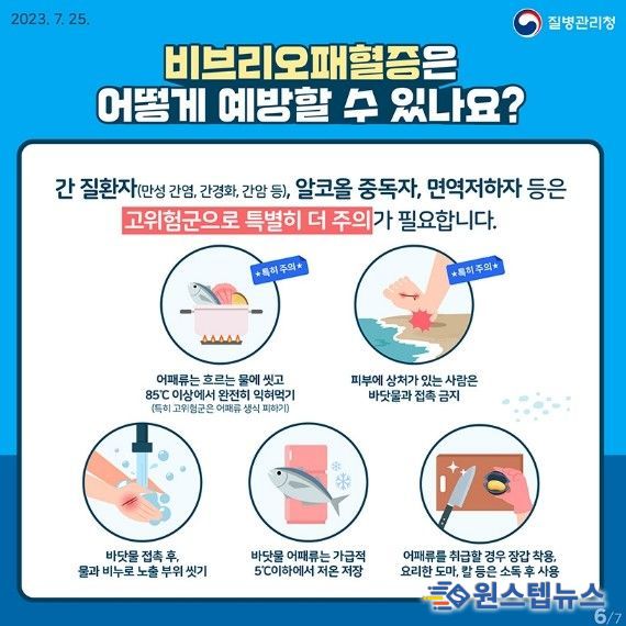 특히 만성 간 질환자, 당뇨병, 알코올의존자, 면역결핍 환자, 악성종양 등 비브리오패혈증 고위험군은 감염 시 치명률이 높으므로 더욱 철저한 주의가 필요하다.