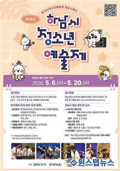 원스텝뉴스 천규영 기자 | 하남시가 주최하고 하남시청소년수련관이 주관하는 ‘2026 제34회 하남시청소년예술제’가 오는 6월 13일 하남시청소년수련관에서 개최된다.