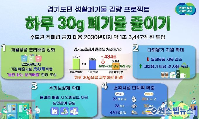 원스텝뉴스 이병희 기자 | 수도권 직매립 금지에 따른 생활쓰레기 감량을 위해 경기도가 2030년까지 5년간 약 1조 5,447억 원을 투입하는 ‘하루 30g, 도민실천형 생활폐기물 감량 프로젝트’를 추진한다.