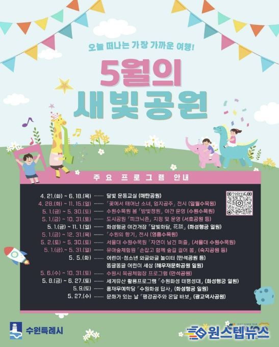 원스텝뉴스 천규영 기자 | 수원특례시는 5월 한 달간 도시공원과 수목원, 수원화성 일원에서 시민 참여형 자연·문화·체험 프로그램을 운영한다. 가정의 달을 맞아 가족 단위로 공원에서 여가와 체험을 함께 즐길 수 있도록 프로그램을 확대했다.