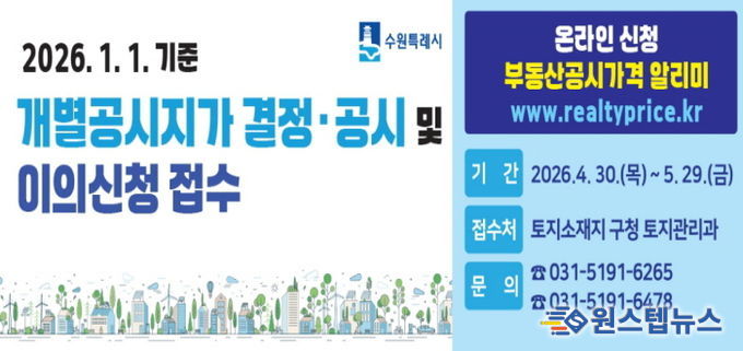 원스텝뉴스 이병희 기자 | 수원시 권선구는 4월 30일 결정·공시되는 개별공시지가에 대해 4월 30일부터 5월 29일까지 이의신청을 접수한다고 밝혔다.